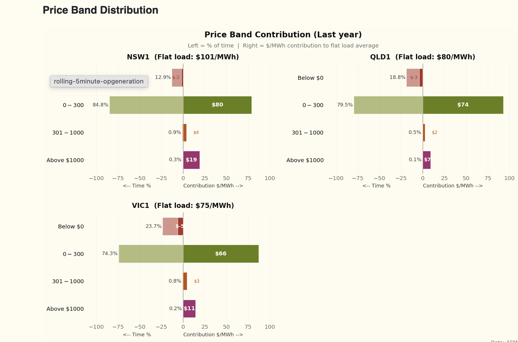 The plot shows that in for instance NSW about 20% of the average annual price comes from spikes that occurred in only 0.3% of the half hours. Some spikes should be expected but when they are driving 20% of the annual price, and that feeds into next year’s price its an indication that either the market is too tight/not resilient to shocks or there is not enough competion.