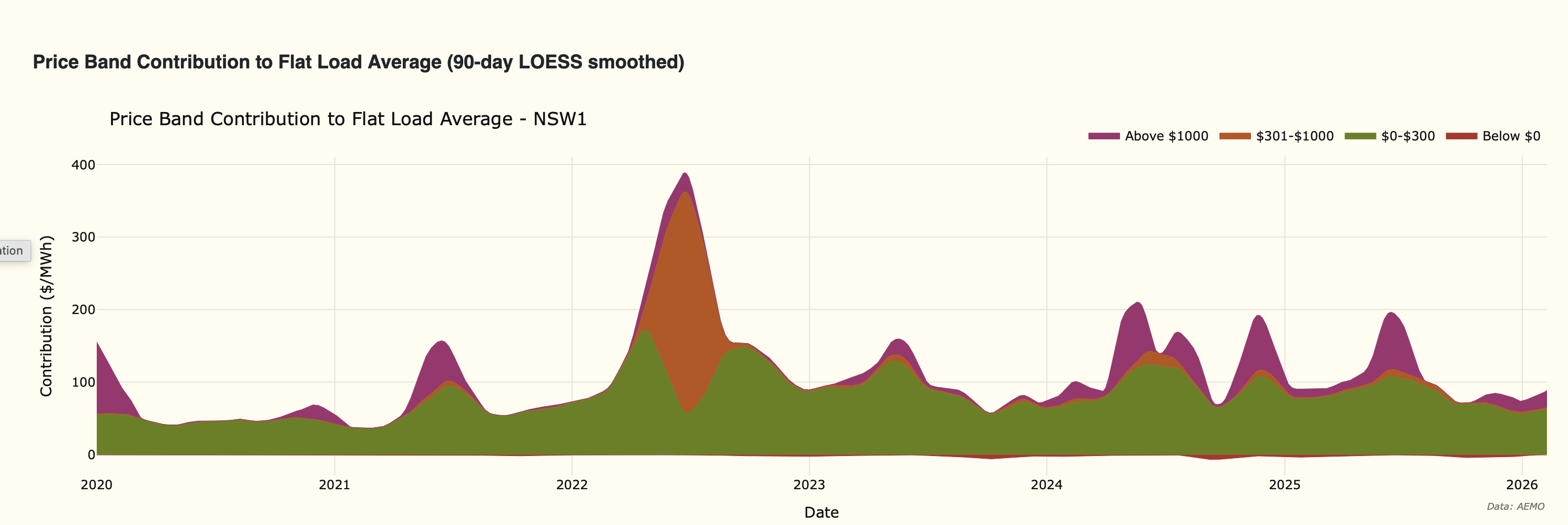 Equally we can look at the contribution of spikes to average prices on a longer term basis. The following figure uses a 90 day moving average of the contribution to average price caused by each price band. It misses the point about frequency but shows how important high prices can be to average prices and if we looked at different States we would see the spikes tend to occur in Winter. In NSW there have been more spikes since the closure of Liddell.