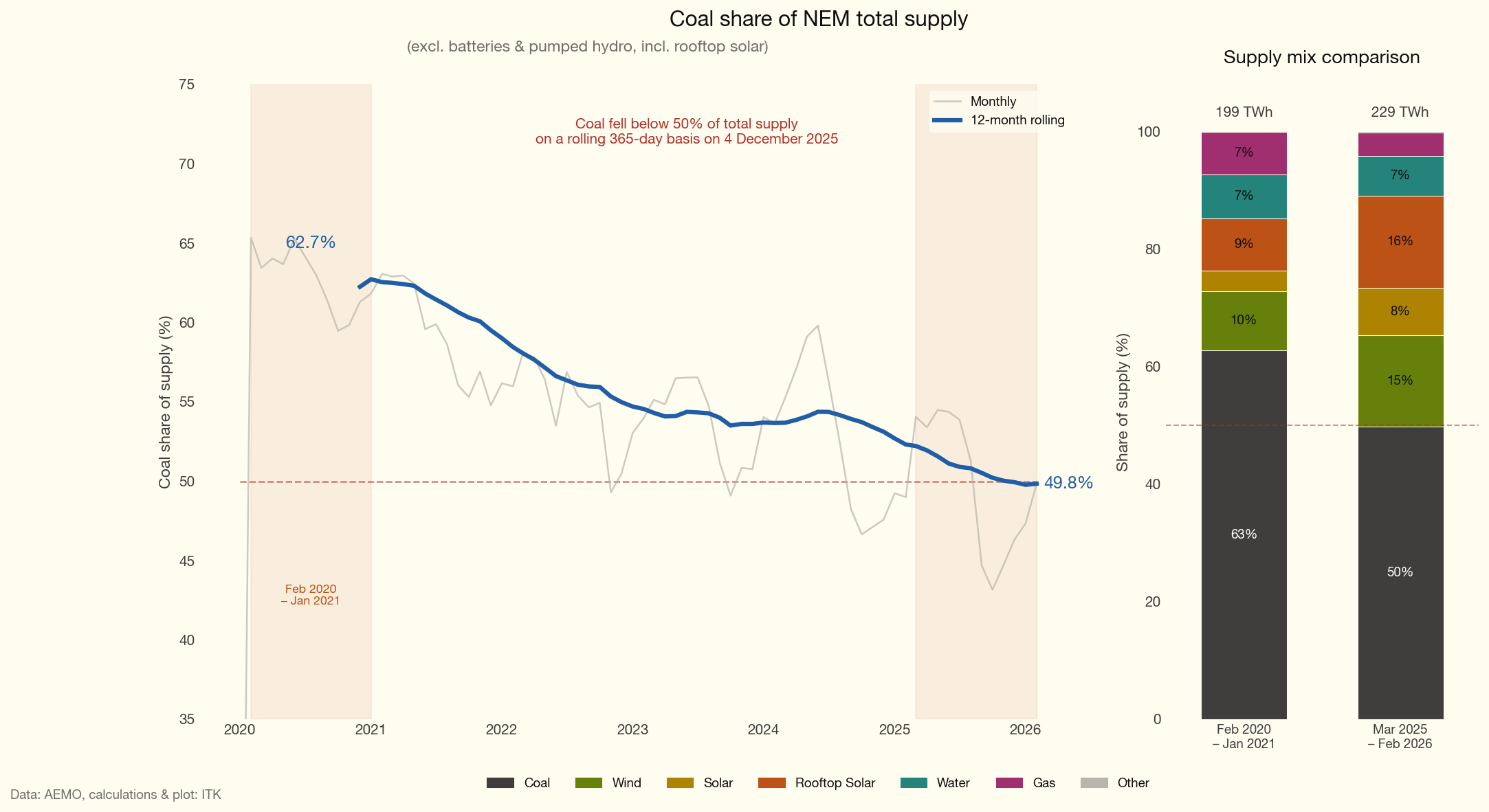 Also noted that the NEM went under 50% for coal generation on a rolling 365 day basis on Dec 3 2025.