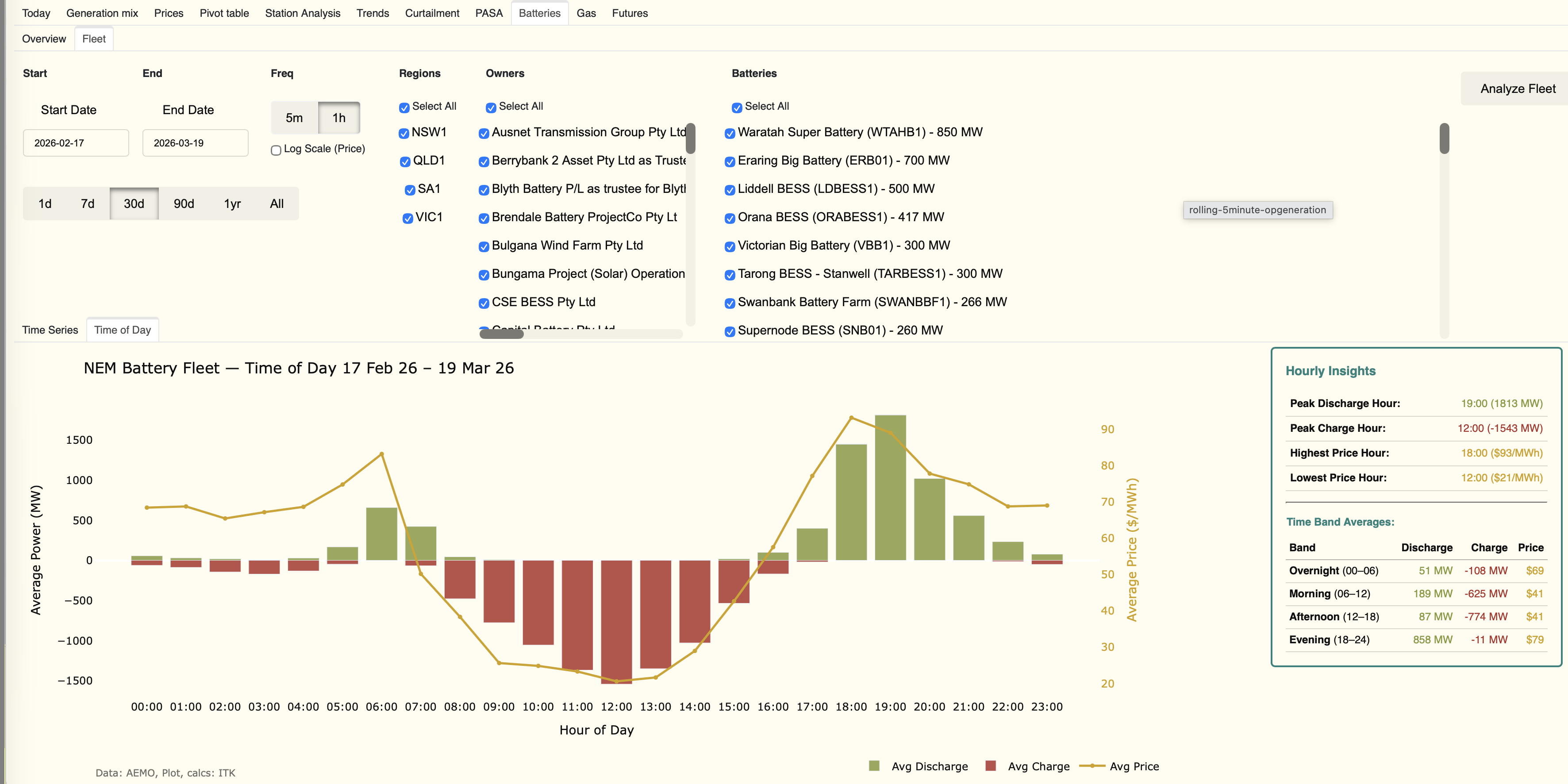 The batteries tab on the dashboard has been changed to allow any collection of batteries to be aggregated and performace, eg average price plotted. Likewise added in a familiar time of day plot to the batteries tab. Other bugs were fixed. One disadvantage of Claude is it tends to leave old code lying around instead of deleting it. On the positive side a battery daemon now runs that checks for new battery records by region and the overall state of charge and records if the state of charge falls below 5%