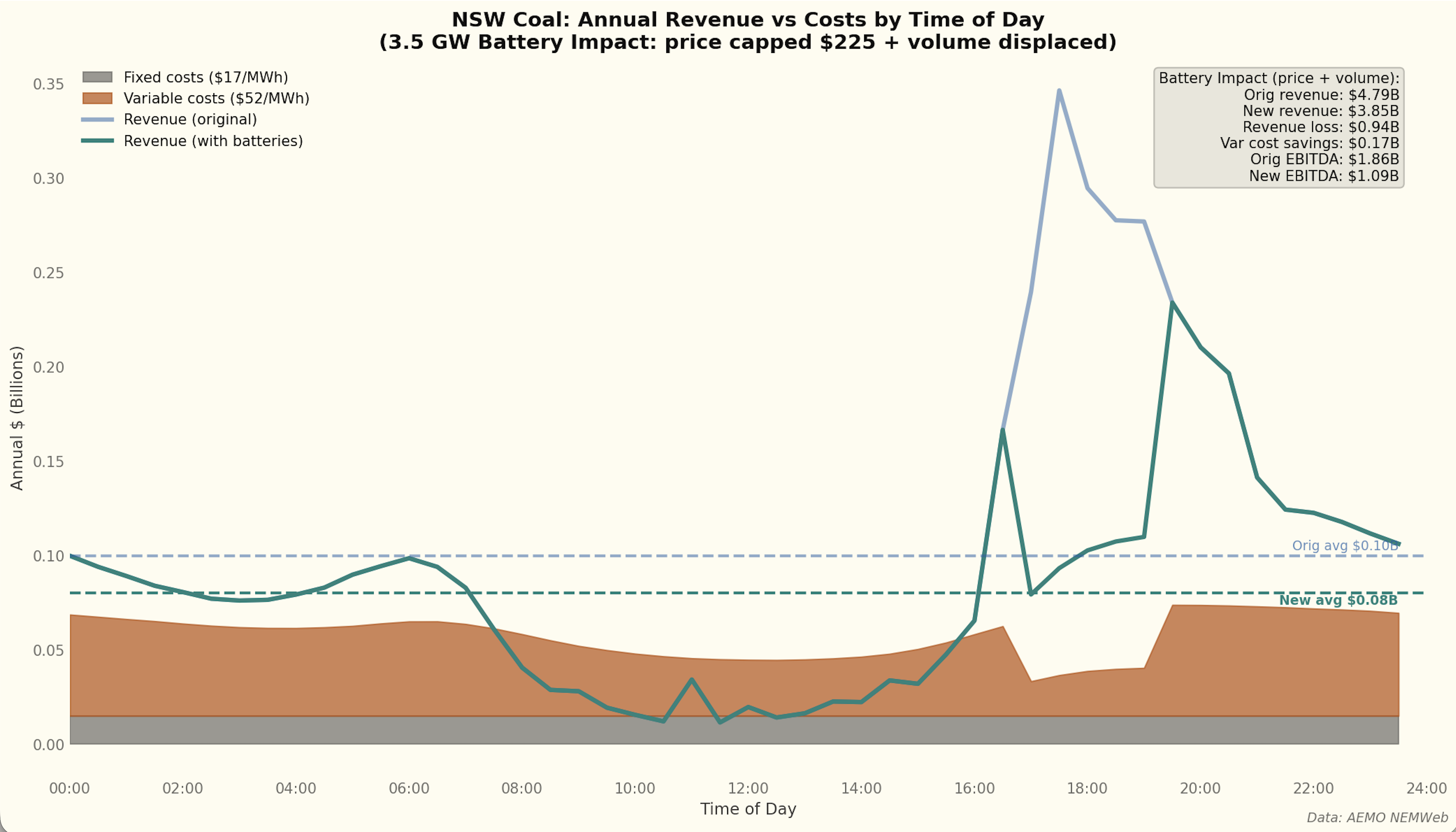 So how will that impact profits? The first step was to think about spot prices. I assumed that this amount of batteries would be enough to see average evening peak spot prices in NSW no higher than $225/MWh but you can make your own number up. This only reduces average price by about $5-7/MWh.