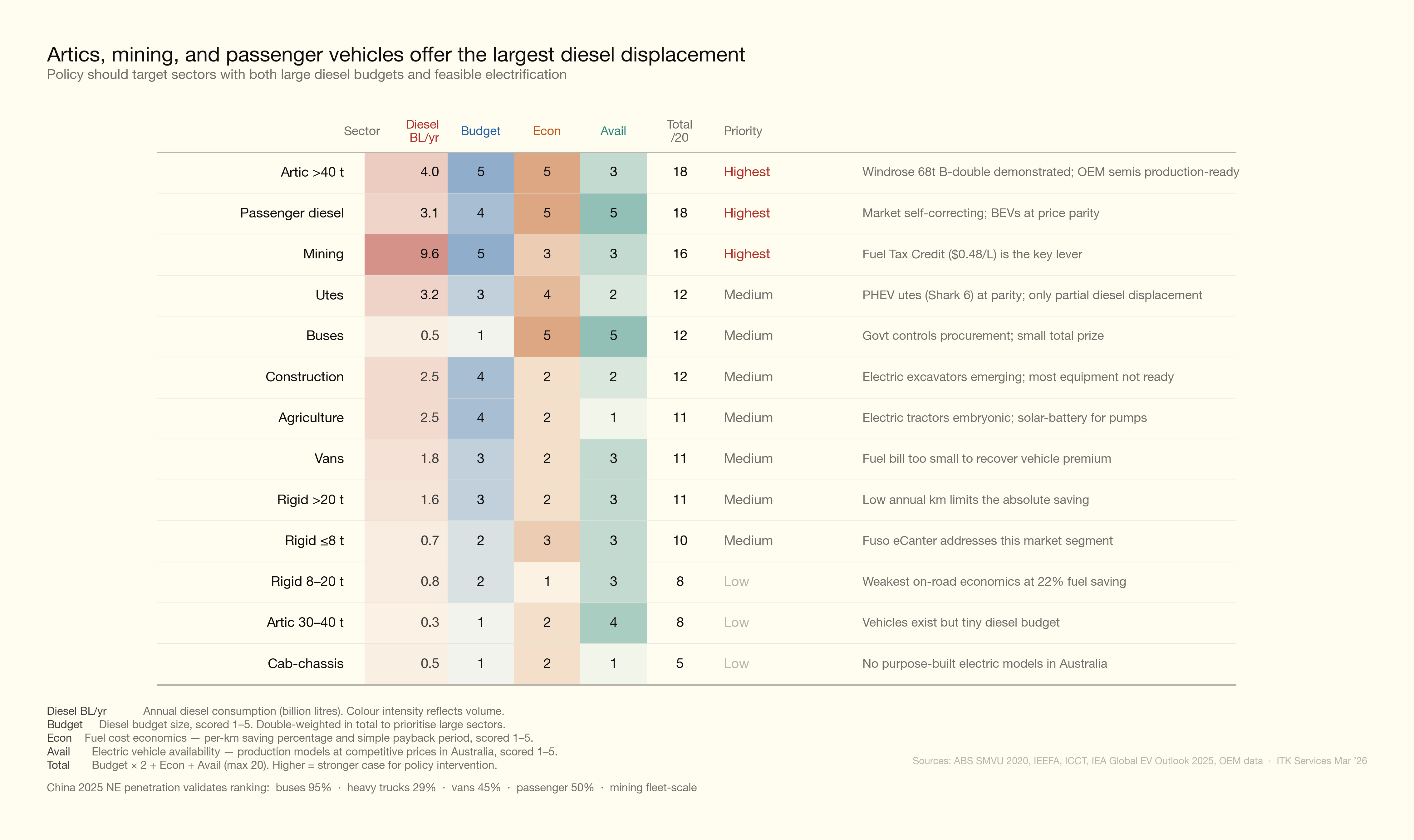 The scorecard ranks segments by diesel volume, electrification economics, and vehicle availability. Heavy articulated trucks, mining, and diesel passenger cars score highest — combining large diesel consumption with either strong economics or minimal capital barriers.