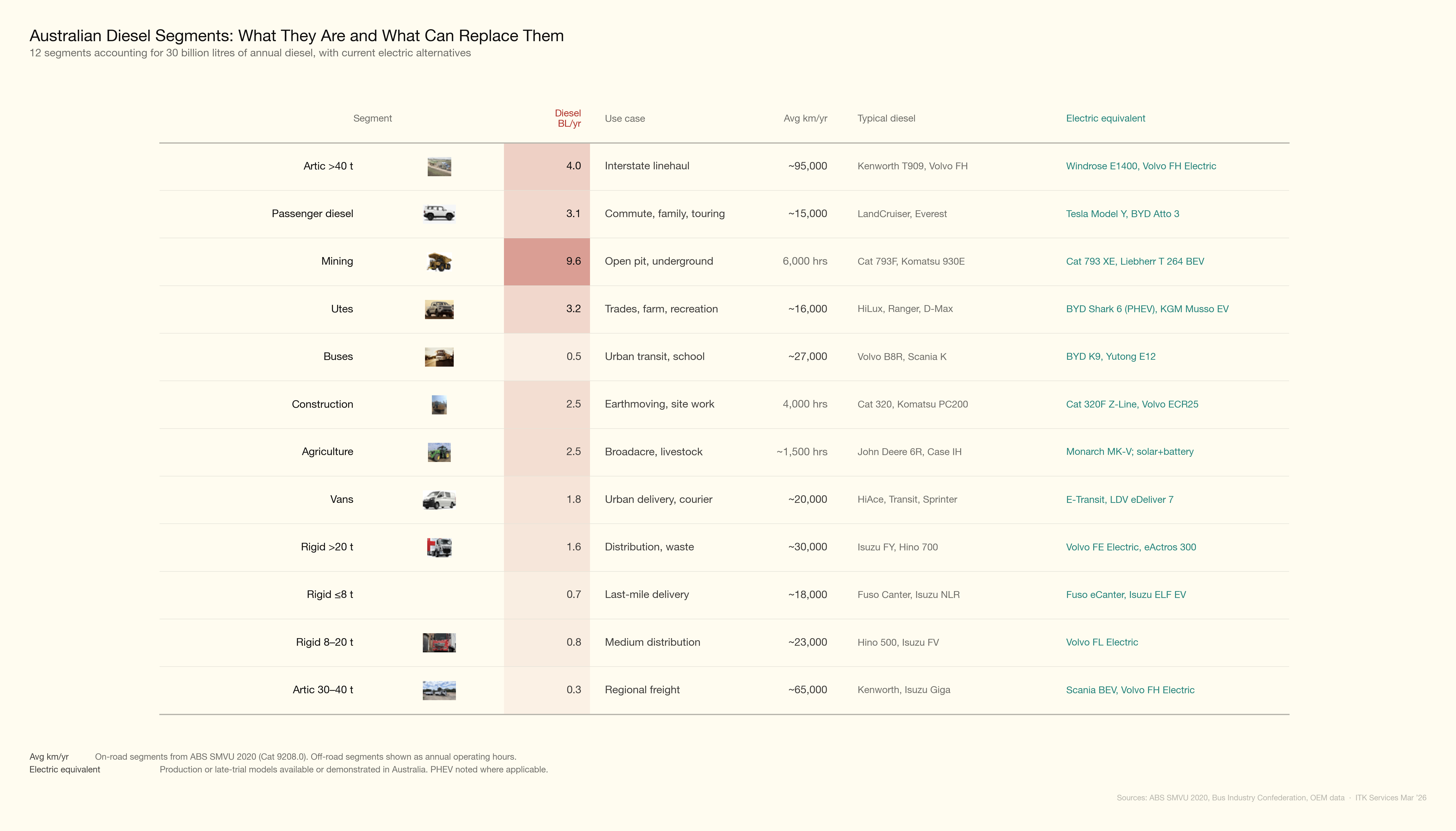 Australia consumed approximately 33.5 billion litres of diesel in 2025, up from 30 billion litres in 2022 (Department of Climate Change, Energy, the Environment and Water, 2026). About 60% is used on-road and 40% off-road. The on-road breakdown by vehicle type comes from the ABS Survey of Motor Vehicle Use (year ending June 2020), the last edition of this survey (Australian Bureau of Statistics, 2020). Off-road estimates are derived from Fuel Tax Credit claims and the IEEFA mining diesel report (Campbell, 2024; IEEFA, 2026). Each segment below includes a Chinese market comparison, since China leads global commercial vehicle electrification and provides the clearest signal of where technology and economics are heading.