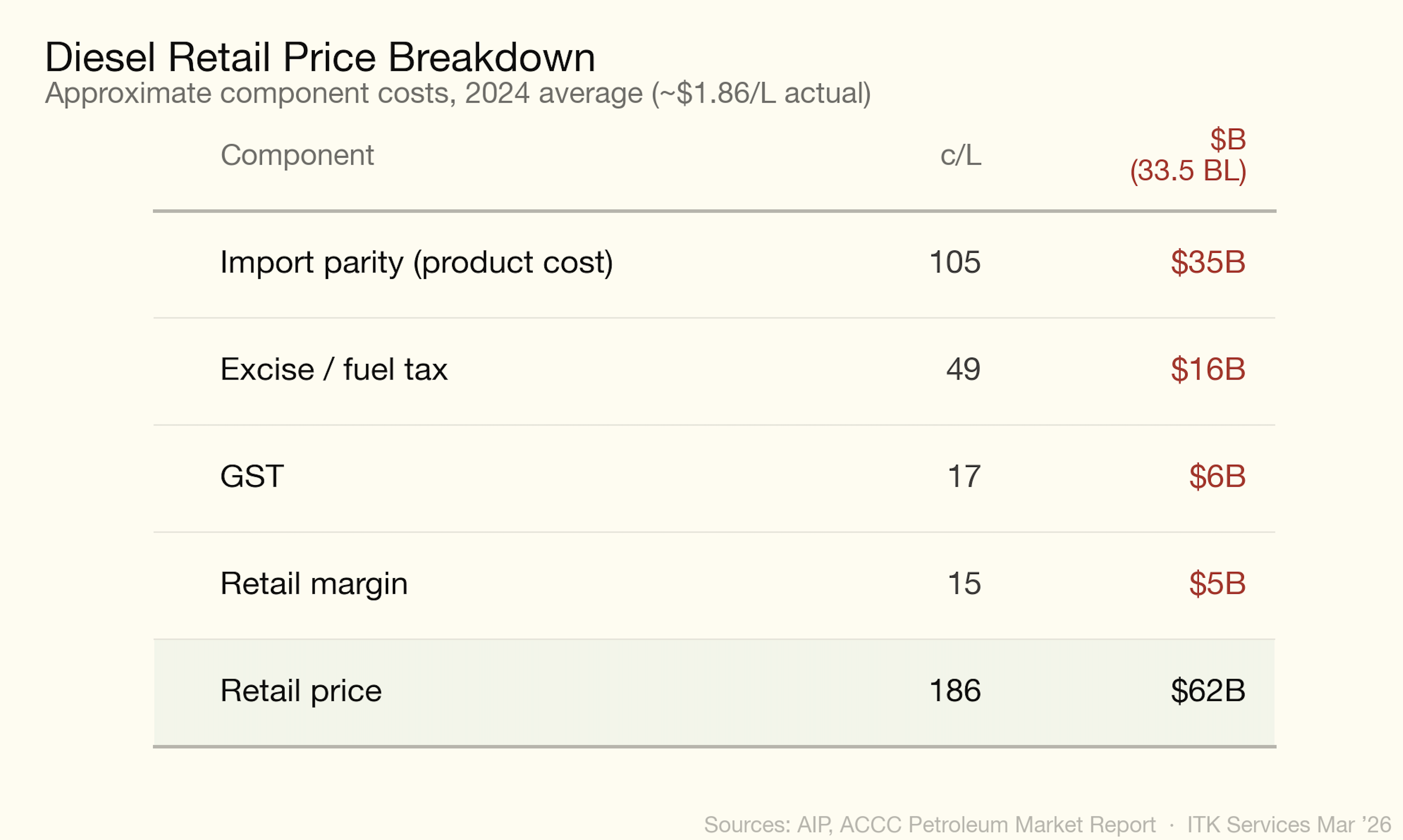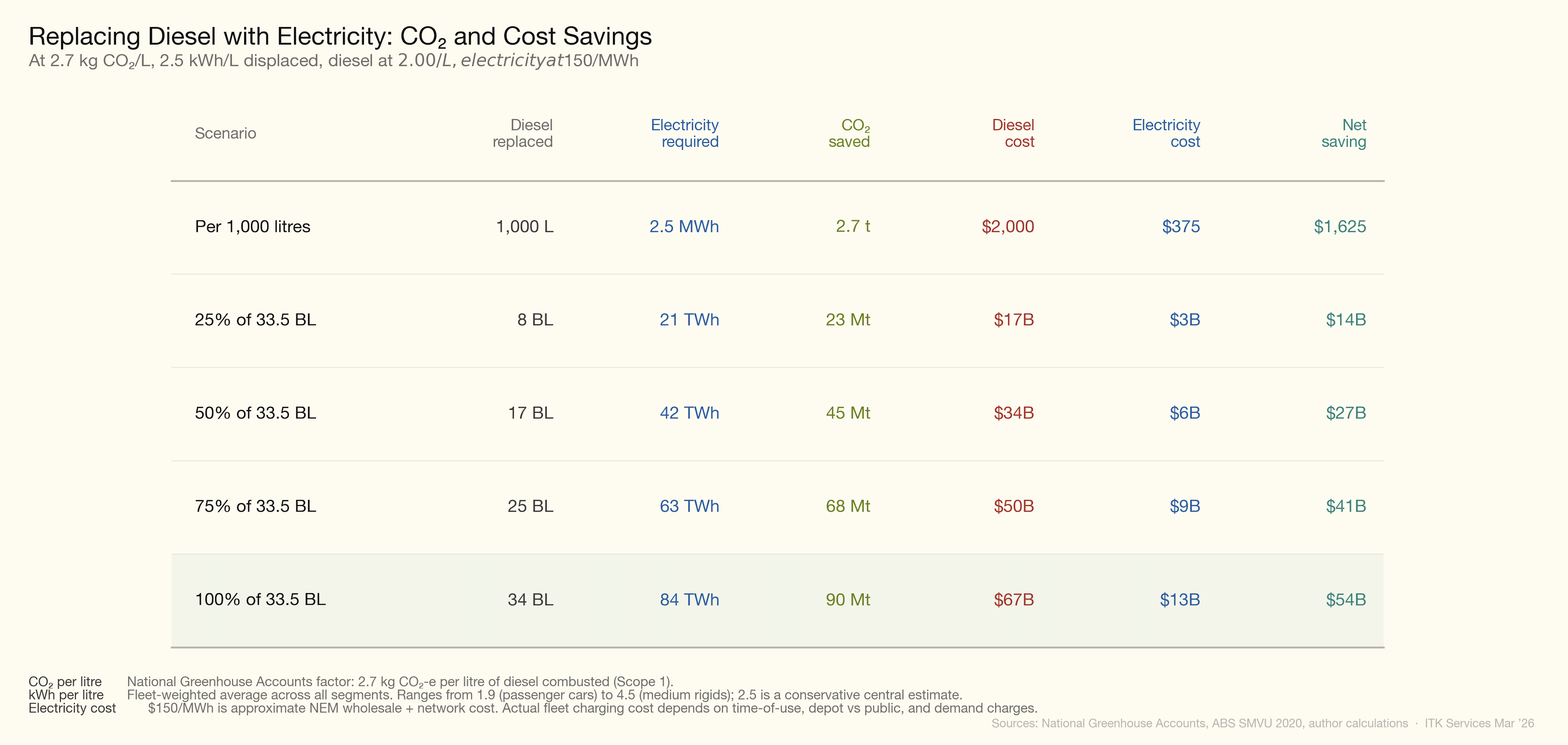 Full electrification of Australia’s diesel fleet would redirect approximately $22 billion per year from petroleum imports to domestically produced electricity — equivalent to roughly 1% of GDP in import substitution. The associated CO2 reduction of 90 Mt (~15% of national emissions) represents a further welfare gain not captured in national accounts. At $176/t CO2, the AER shadow price represents around $15 bn in welfare gains. For scale, the NDIS costs roughly $45 bn per year.