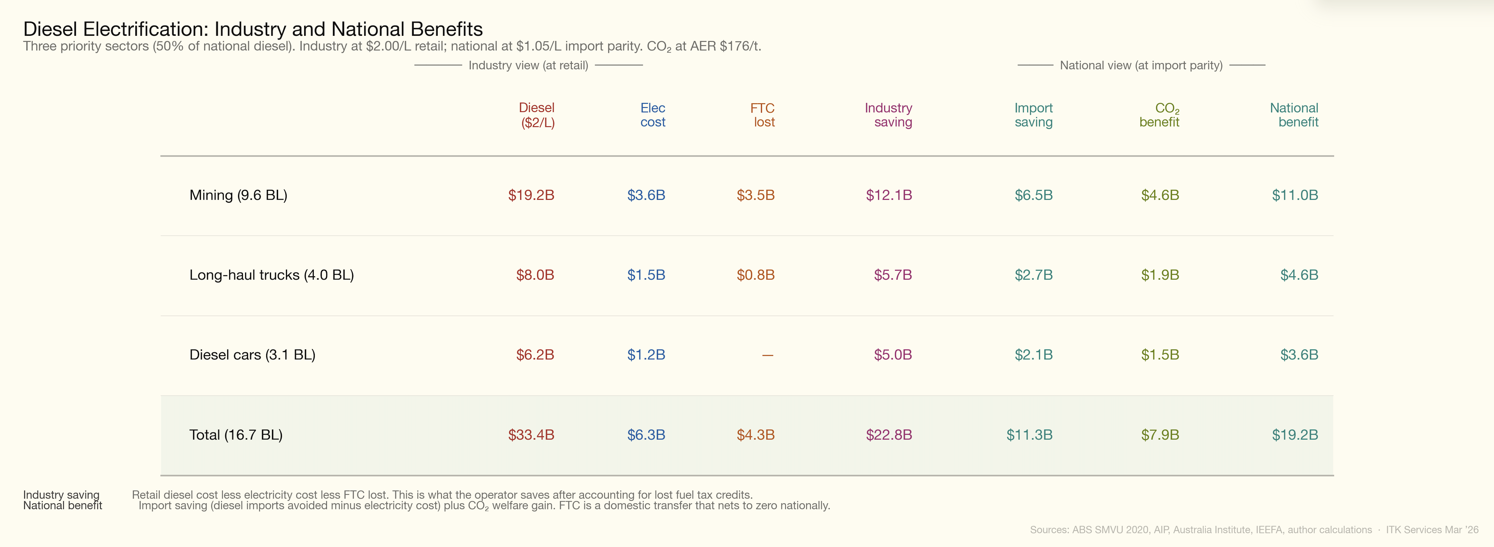 At retail prices, 100% diesel replacement costs about $67 bn at the pump, and using $150/MWh for electricity the savings are a remarkable $54 bn per year. However, the productivity implications are better measured using the import cost of diesel — about $35 bn — which means that at 100% diesel replacement Australia saves about $22 bn a year in import substitution. To that I would add $15 bn representing the value of 90 Mt of avoided CO2 at the AER 2035 price of $176/t. So that’s a total of $37 bn a year, or about 2% of GDP.