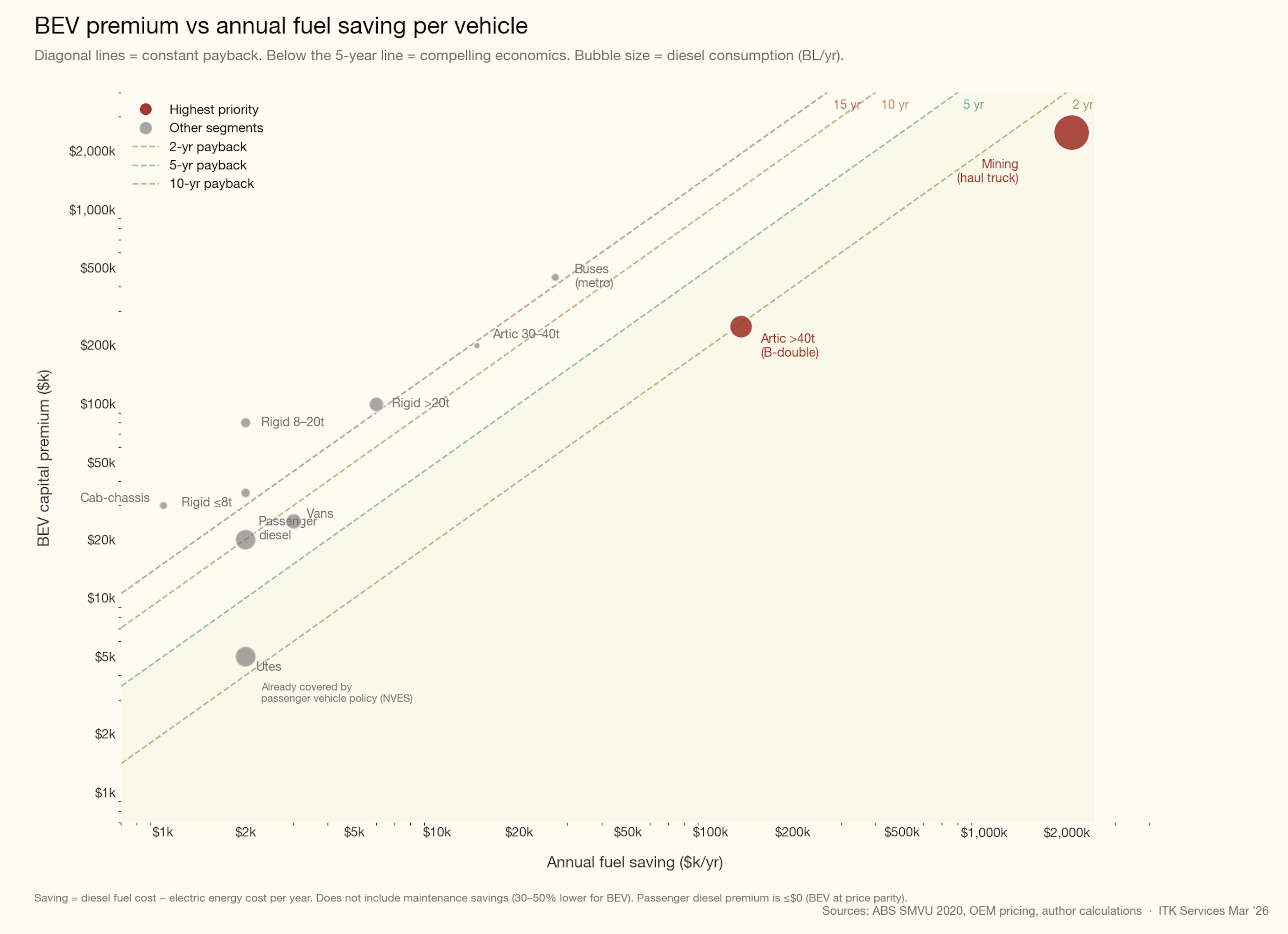 For the industry to act it needs to get a return. For the Government, and considering national security, economics and the size of the target; it wants — or ought to want — to focus on sub-segments where there is lots of diesel consumption. Contrary to what I thought when I started looking at this, the big diesel consumers are mining and long haul trucking. It’s no coincidence that it’s those sectors where fuel consumption per vehicle is high and where therefore electrification potentially offers the largest annual saving to offset against the higher capital cost.