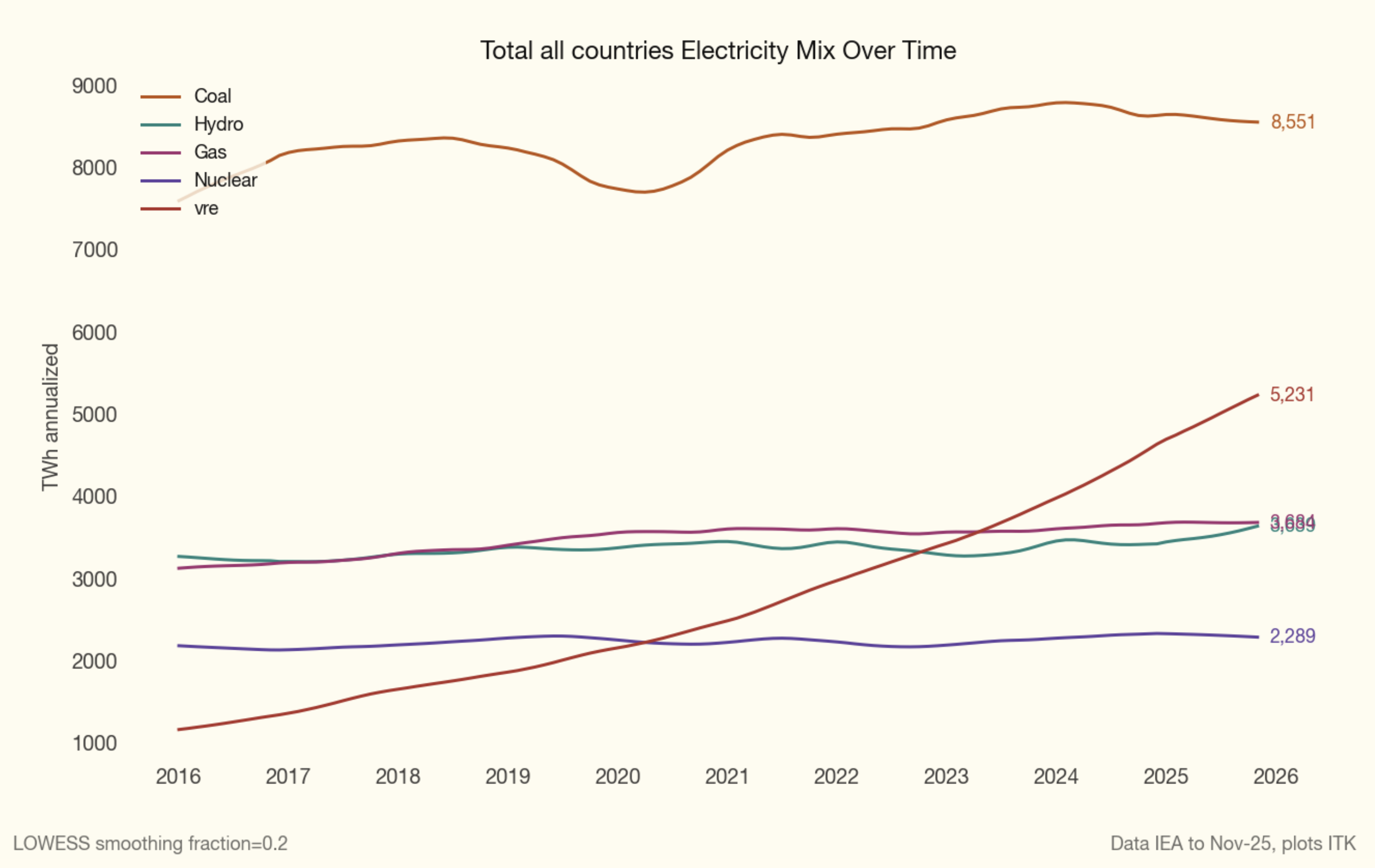 The IEA releases a .csv file of global electricity data every month. It lags a bit due to its comprehensive nature, the latest data runs to November 2025. I maintain a dashboard on my website that updates the data every couple of months and looks at the trends.