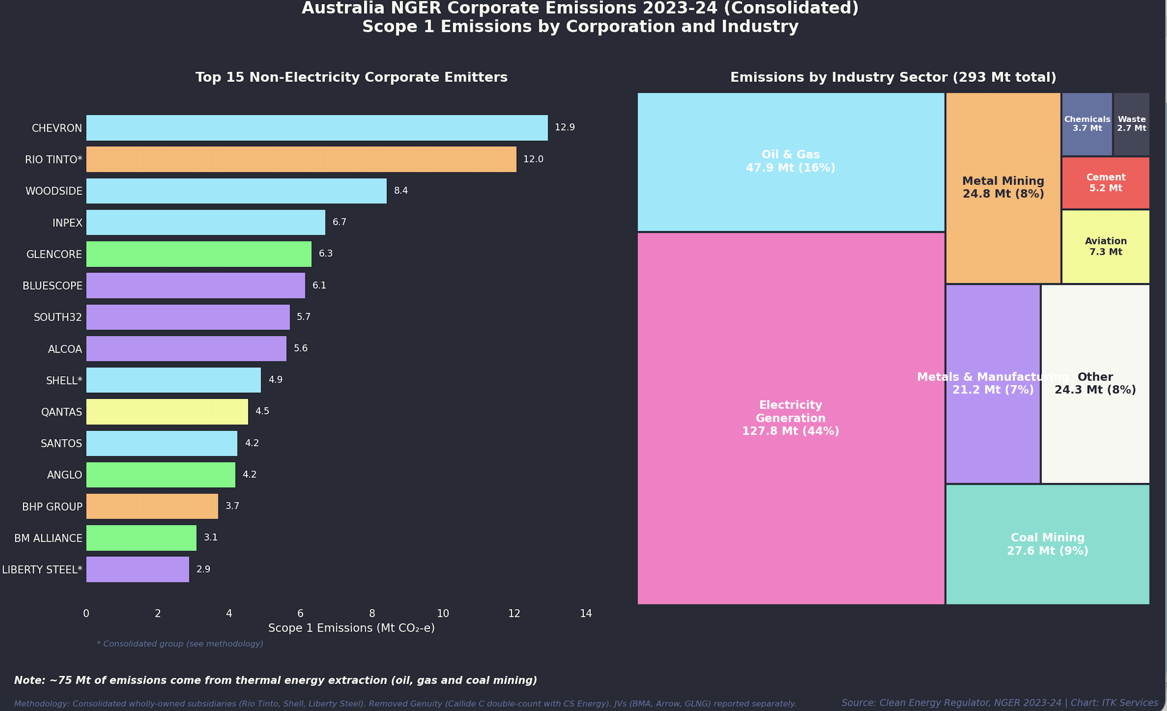 The following visualisation shows the top emitters and the industries. I’ve included electricity in the industry overview although it’s excluded from the Safeguards scheme.