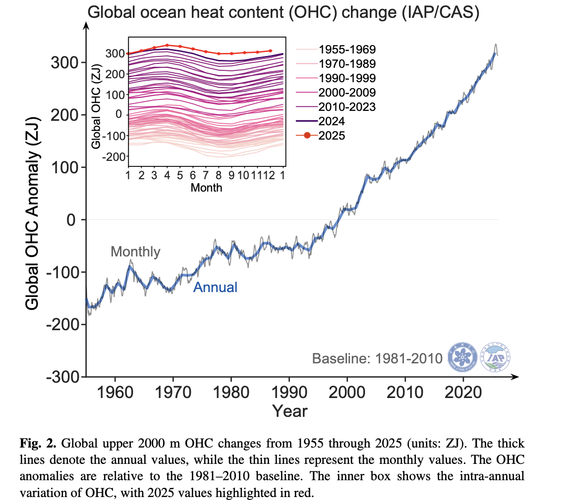 This section is almost entirely sourced from: Ocean Heat Content sets another record in 2025 This 2025 update is part of series that is promptly updated every year in January of the following year. Considering the many authors from varying countries, primarily China and the USA, its a great example of how things can be done efficiently.