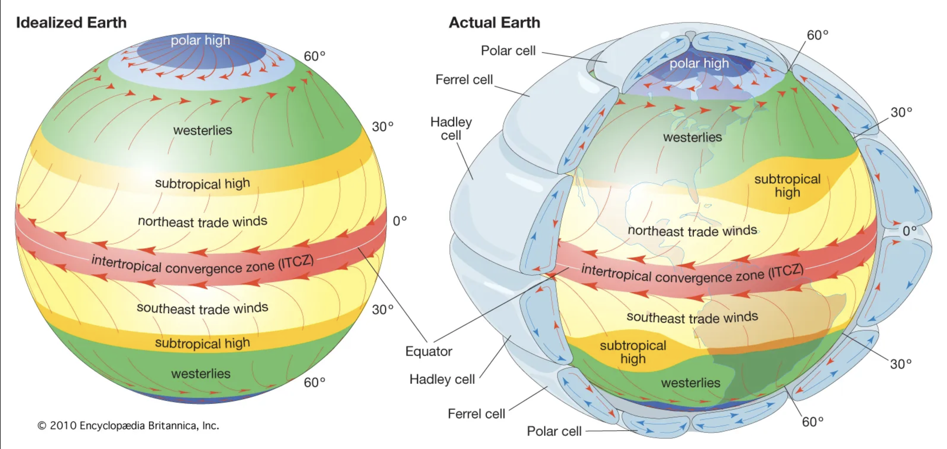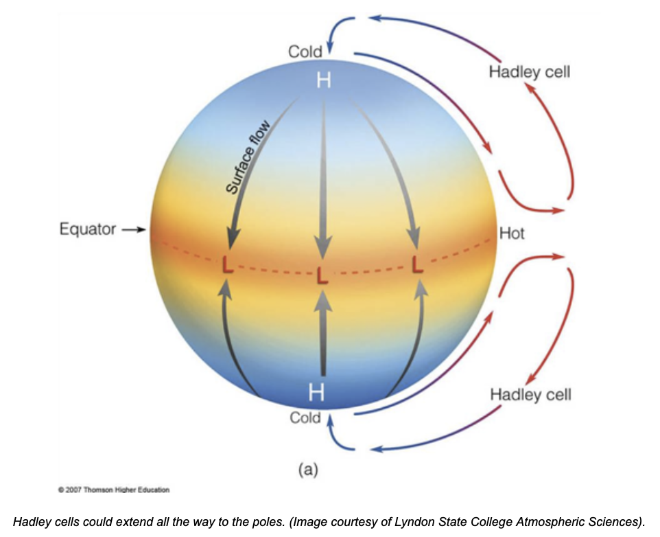 Apparently there are also other cells, polar cells and then “Ferrel cells” in between the polar and Hadley cells.